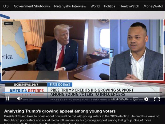 A CBS News segment featuring CJ Pearson analyzing Donald Trump’s rising support among young voters in the 2024 election.